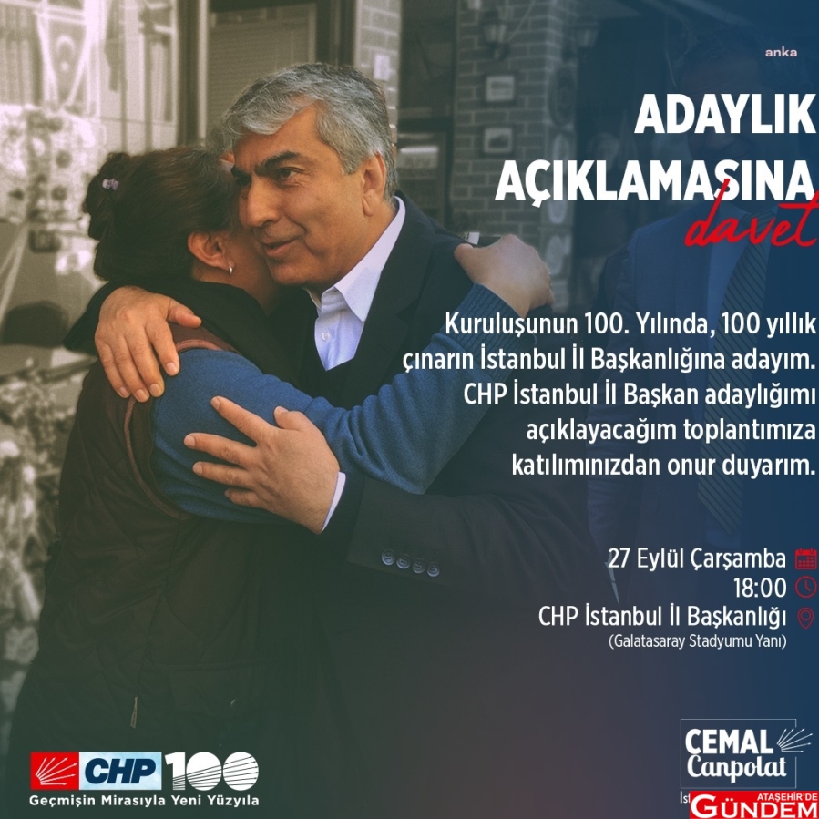 Eski CHP İstanbul İl Başkanı Cemal Canpolat, CHP İstanbul İl Başkanlığı’na aday olduğunu açıkladı. Canpolat, “Kuruluşunun 100. Yılında, 100 yıllık çınarın İstanbul İl Başkanlığına adayım. 27 Eylül Çarşamba günü saat 18:00’de tüm yol arkadaşlarımı İstanbul İl başkanlığımıza bekliyoruz” açıklamasını yaptı.