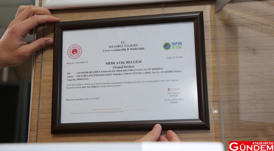 Çevre, Şehircilik ve İklim Değişikliği Bakanlığı Sıfır Atık Yönetmeliği’ne göre; Ataşehir Belediye Başkanlığı Ana Hizmet Binası, Prof. Dr. Türkan Saylan Tıp Merkezi, Kadın Sağlığı Merkezi, Ferhatpaşa Sağlık Polikliniği, Mustafa Saffet Kültür Merkezi, Zübeyde Hanım Eğitim ve Kültürevi, İçerenköy Sanat Eğitim Merkezi, Ferhatpaşa Bilim ve Sanat Merkezi, Ahmet Telli Çocuk ve Halk Kütüphanesi, Ferhatpaşa Gençlik Merkezi, ATAMEM, Yenisahra ATAMEM, Ataşehir Belediyesi Nikah Salonu, Aşevi, Ulaşım Hizmetleri Merkez Garajı, Mevlana ve Mustafa Kemal Ataevi olmak üzere Ataşehir’de toplam 17 nokta, sıfır atık belgesi almaya uygun bulundu.