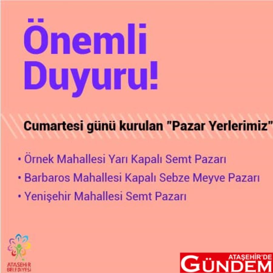 Ataşehir Belediyesi sokağa çıkma kısıtlamasının kaldırdığı Cumartesi gününde pazar yerlerini açma kararı aldı. Karara göre Örnek Mahallesi Yarı Kapalı Semt Pazar, Barbaros Mahallesi Kapalı Sebze Meyve Pazarı, Yenişehir Mahallesi Semt Pazarı Cumartesi pazarları Cumartesi günleri açık olacak.