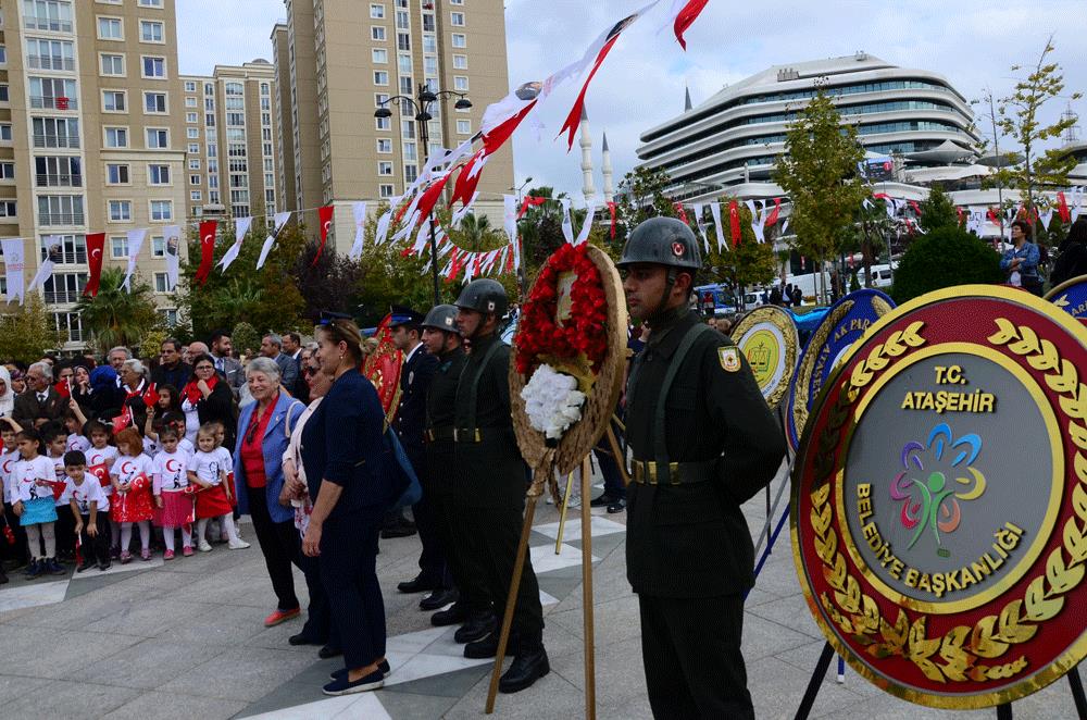 Bu yıl düzenlenecek olan renkli kutlamaların ilk ayağı saat 13.00’de Cumhuriyet Meydanı’ndaki Atatürk Anıtı’na çelenk koyma töreni ile başladı. Ataşehir Kaymakamı İsmail Hakkı Ertaş, CHP Genel Başkan Yardımcısı Onursal Adıgüzel, Garnizon Komutan Vekili Metin Durmuş, Ataşehir Belediye Başkan Vekili İlhami Yılmaz, siyasi partilerin ilçe başkanları, Milli Eğitim Müdürü Ertuğrul Bilican, Ataşehir Zabıta ekibi, STK temsilcileri ve çeşitli dernekler, öğrenciler, öğretmenler ve birçok Ataşehirli Cumhuriyet Meydanı’ndaki çelenk koyma törenine katılanlar arasındaydı. Protokol çelenklerinin konulmasıyla başlayan tören Gazi Mustafa Kemal Atatürk ve silah arkadaşları için saygı duruşu ve İstiklal Marşı ile devam etti.