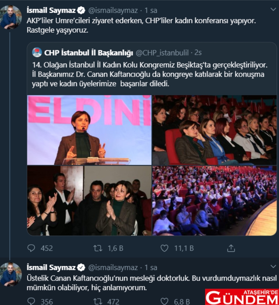 Gazeteci İsmail Saymaz, Twitter hesabından yaptığı paylaşımda, “AKP’liler Umre’cileri ziyaret ederken, CHP’liler kadın konferansı yapıyor. Rastgele yaşıyoruz. Üstelik Canan Kaftancıoğlu’nun mesleği doktorluk. Bu vurdumduymazlık nasıl mümkün olabiliyor, hiç anlamıyorum” yazdı.