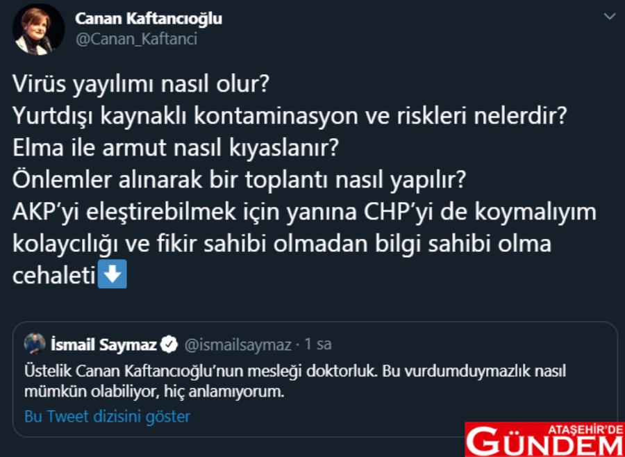 “Virüs yayılımı nasıl olur? Yurtdışı kaynaklı kontaminasyon ve riskleri nelerdir? Elma ile armut nasıl kıyaslanır? Önlemler alınarak bir toplantı nasıl yapılır? AKP’yi eleştirebilmek için yanına CHP’yi de koymalıyım kolaycılığı ve fikir sahibi olmadan bilgi sahibi olma cehaleti.”Cumhuriyet