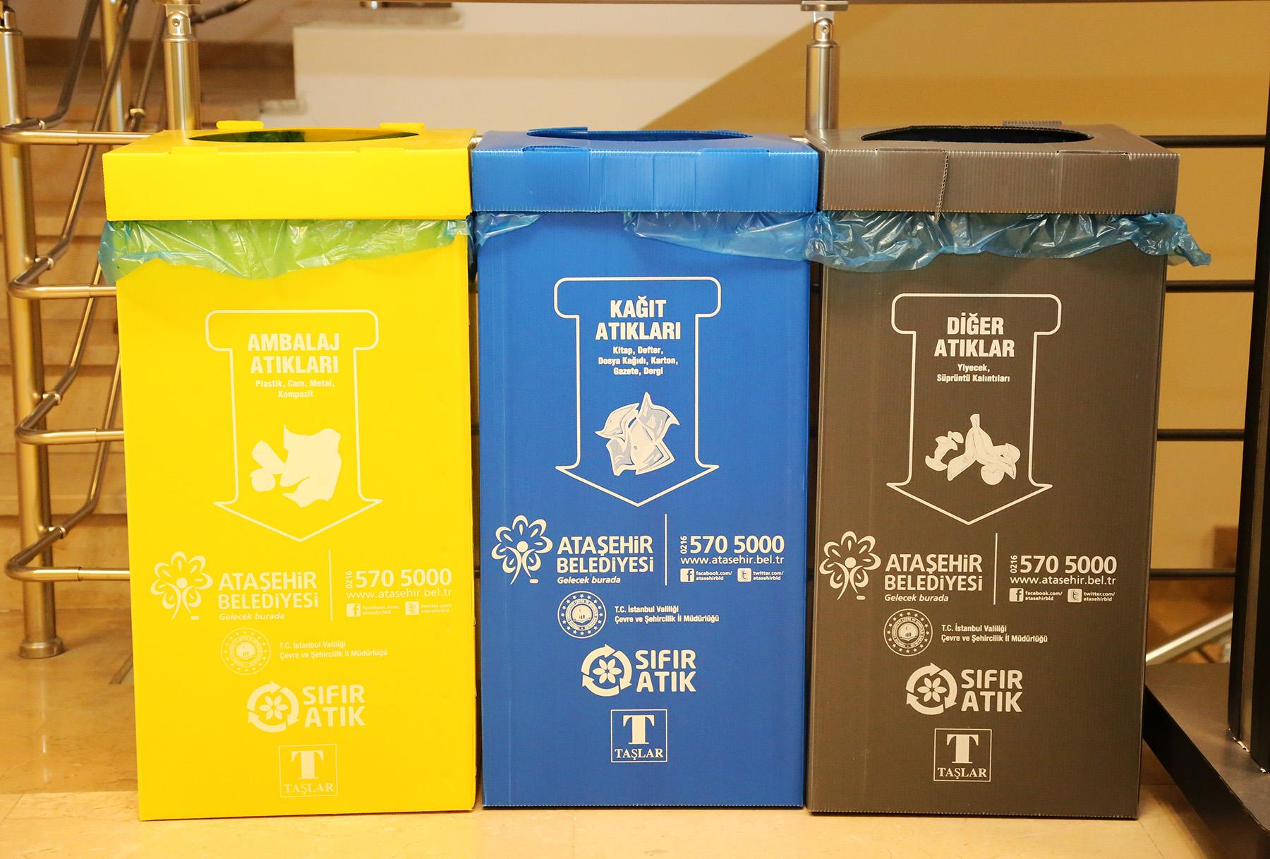 Tüm atıkların kaynağında ayrışmasını sağlayan Ataşehir Belediyesi’nde her katta; kağıt-karton atık için mavi renkli, plastik, cam ve metal atıklar için sarı renkli ve evsel nitelikli diğer atıklar için gri renkli olmak üzere, elektronik atık, bitkisel atık yağ, plastik kapak, atık floresan ve atık pil kutuların da yer aldığı sıfır atık toplama noktaları oluşturuldu.