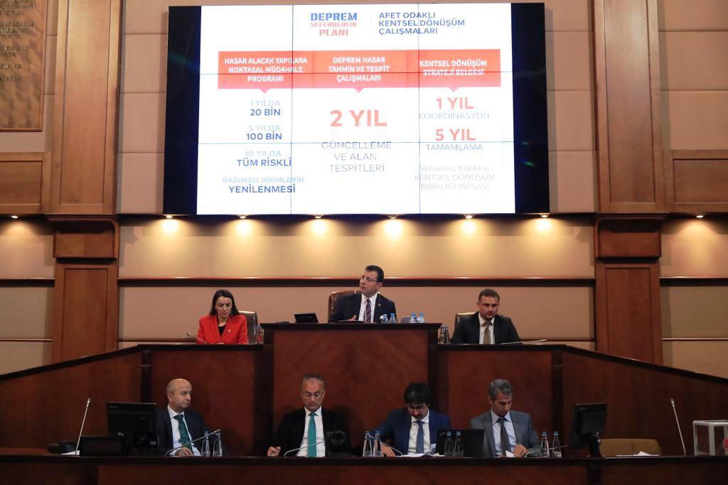 İBB Başkanı Ekrem İmamoğlu, Meclis toplantısında “deprem” konulu 13 bölümlük detaylı bir sunum yaptı. İBB’nin, özellikle 1999 Marmara Depremi sonrasında, depreme hazırlık konusunda ulusal ya da uluslararası birçok kurum ile farklı çalışmalar yaptığını hatırlatan İmamoğlu, “Tespitlerde bulunulmuş, tahminler sıralanmış, uygulama önerileri geliştirilmiş. Ancak yapılan tüm bu çalışmalar, sonrasında hayata geçmediği / geçemediği için İstanbul hala beklenen büyük depreme hazırlıklı değildir. Daha fazla beklemeye tahammülümüz yok” dedi. “İBB Deprem Seferberlik Planı”nı devreye soktuklarını vurgulayan İmamoğlu, “Bizler, tüm İstanbulluların da desteği ile hayata geçecek projeler üretmek, İstanbul’u güçlendirmek için kolları sıvıyoruz ve bir seferberlik başlatıyoruz” diye konuştu.