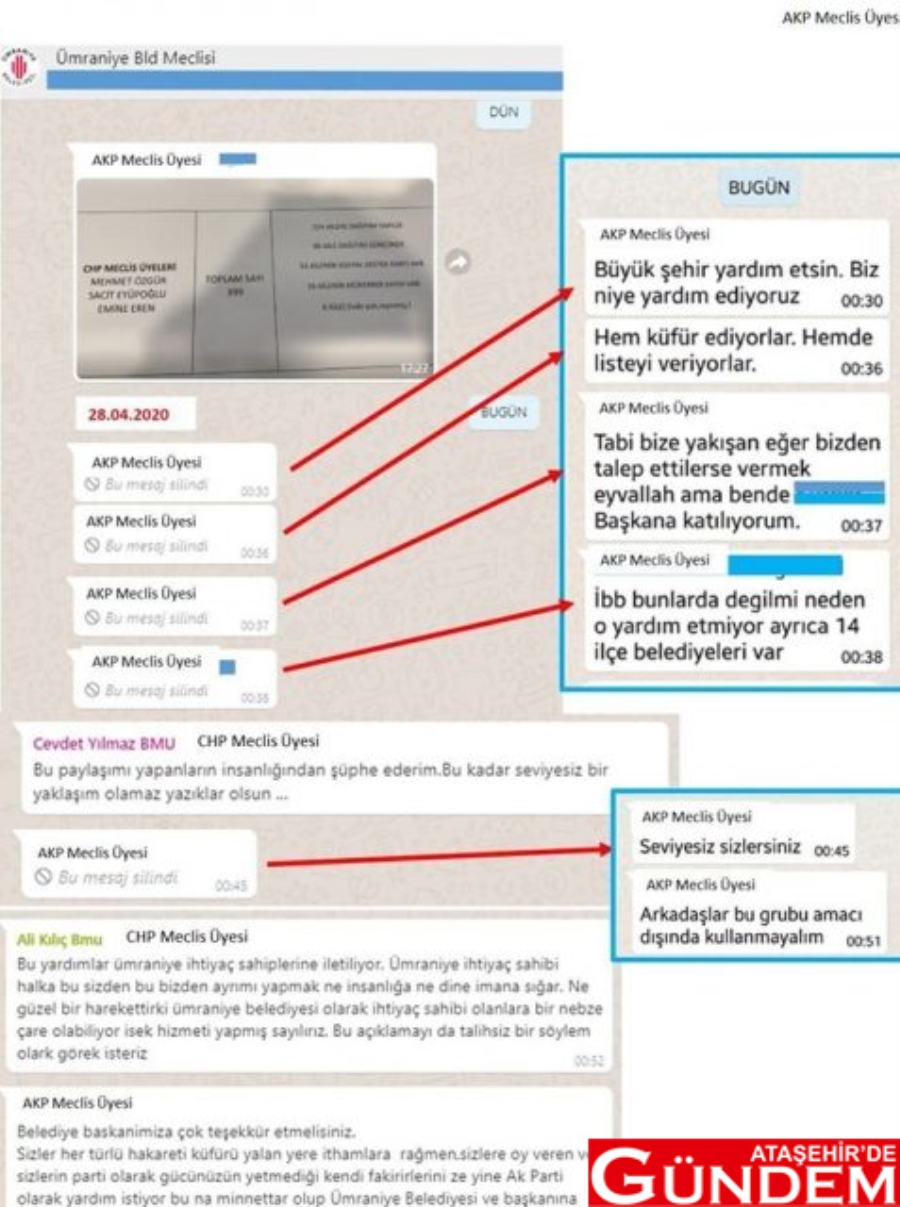 AKP'li meclis üyelerinin, CHP'li meclis üyelerinin de bulunduğu WhatsApp grubunda; “Biz neden CHP'lilerin belirlediği isimlere yardımda bulunuyoruz? Herkes kendi fakirine kendi yardım etsin” diye yazdığı ayrımcı mesaj dikkat çekmişti.