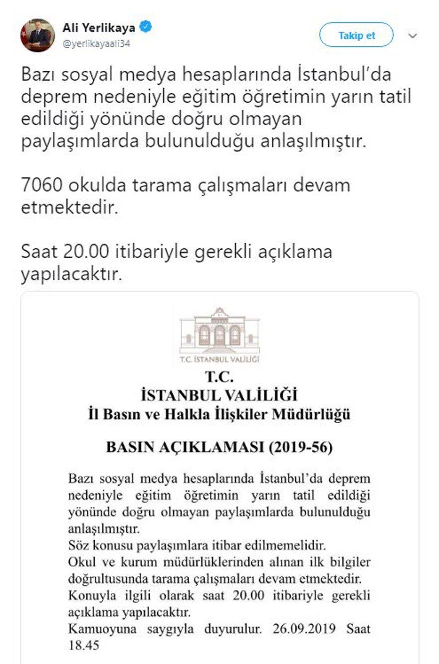 “Bazı sosyal medya hesaplarında İstanbul'da deprem nedeniyle eğitim öğretimin yarın tatil edildiği yönünde doğru olmayan paylaşımlarda bulunulduğu anlaşılmıştır.