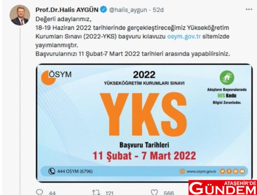 Üniversiteye girmek için en önemli adımlardan biri olan 2022 YKS kılavuzu ÖSYM tarafından yayınladı. ÖSYM Başkanı Halis Aygün sosyal paylaşım sitesi Twitter hesabından yaptığı paylaşımda, "Değerli adaylarımız, 18-19 Haziran 2022 tarihlerinde gerçekleştireceğimiz Yükseköğretim Kurumları Sınavı (2022-YKS) başvuru klavuzu osym.gov.tr sitemizde yayımlanmıştır. Başvurularınızı 11 Şubat-7 Mart 2022 tarihleri arasında yapabilirsiniz" ifadelerini kullandı.