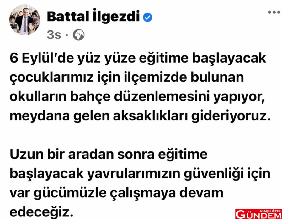 Ataşehir Belediyesi ilçede bulunan okulları 6 Eylül’e hazırlıyor. Her türlü tamirat çalışmalarının gerçekleştiği okul binalarında ihtiyaca yönelik çalışmalar da değerlendiriliyor. Konuyla ilgili sosyal medyadan paylaşım yapan Ataşehir Belediye Başkanı Battal İlgezdi, bu eğitim öğretim yılında da çocukların yanında olduğunu belirterek şu mesajı paylaştı:“6 Eylül’de yüz yüze eğitime başlayacak çocuklarımız için ilçemizde bulunan okulların bahçe düzenlemesini yapıyor, meydana gelen aksaklıkları gideriyoruz. Uzun bir aradan sonra eğitime başlayacak yavrularımızın güvenliği için var gücümüzle çalışmaya devam edeceğiz."