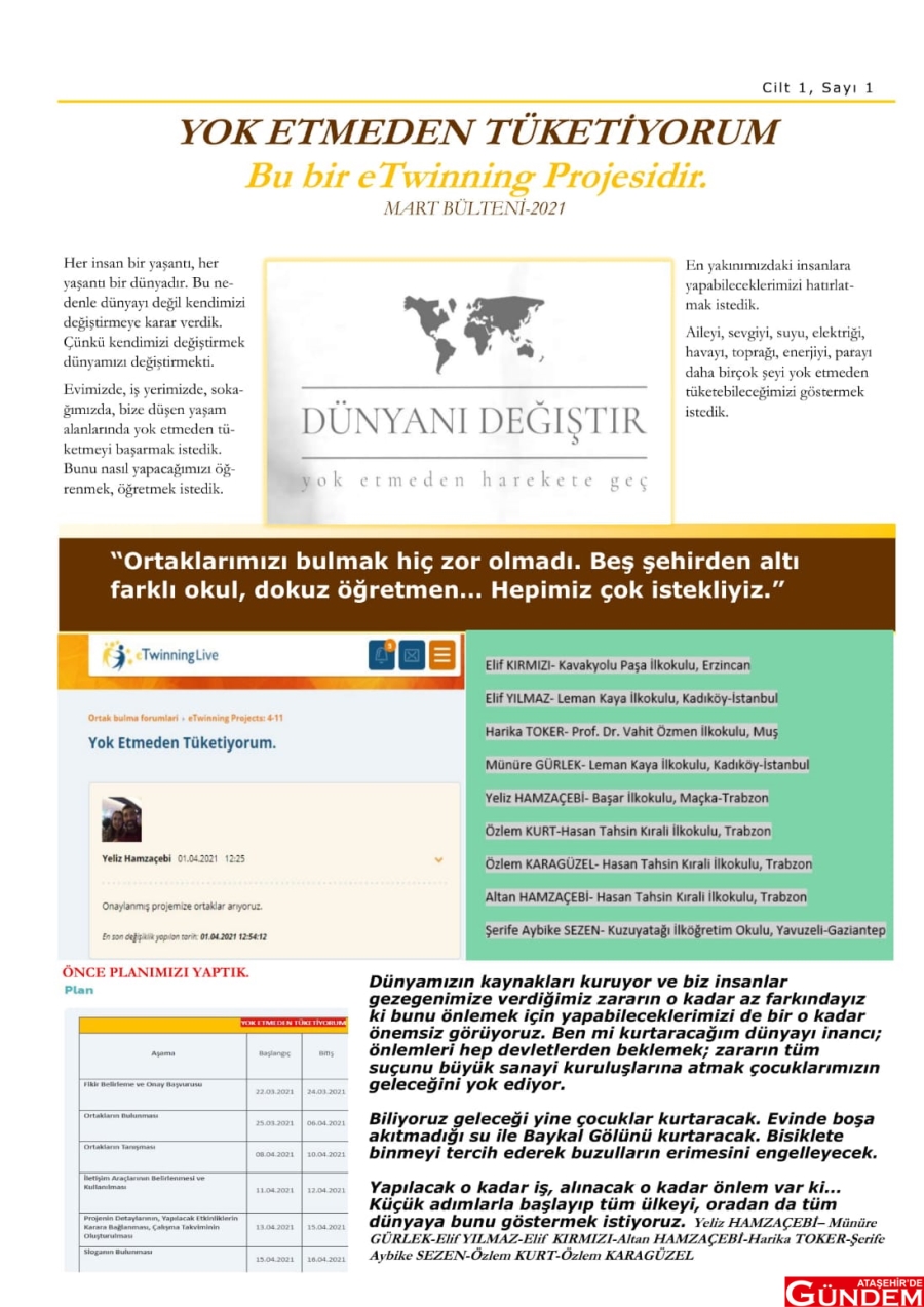 Yaşam boyu önemli olan kaynakların gerektiği kadar, idareli, dikkatli ve bilinçli tüketilmesi için tasarruf bilinci üzerine farkındalık oluşturan “Yok Etmeden Tüketiyorum” proje ekibi dünyanın değişeceğine inanarak doğa dostu projeye imza atıyorlar. Beş ayrı şehirden ve altı ayrı okuldan dokuz öğretmen olarak belirlenen ekip, yarının geleceklerine ışık oluyor. Proje sorumluları; Münire Gürlek, Yeliz Hamzaçebi, Elif Kırmızı, Elif Yılmaz, Harika Toker, Aybike Sezen, Özlem Kurt, Özlem Kara Güzel, Altan Hamzaçebi isimlerinden oluşuyor. Zoom ve çeşitli iletişim kanallarından ilerleyen projenin ayrıca blog kurulumu da gerçekleştirilerek daha fazla kişiye ulaşılması sağlanırken, oluşturulan blogda ekip yöneticilerinden Altan Hamzaçebi konuyla ilgili şunları söylüyor: “Sınırsız değildi kaynaklarımız. Ama onları o kadar çok ve hızlı tüketmeye başladık ki sonunda buzullar eridi; ekolojik denge bozuldu. İklimler değişip mevsimler zamanını şaşırdı. Ama yine de dönüyor dünya. Her şeye rağmen. Bize rağmen.” ve Altan Hamzeçebi projenin belki de çıkış cümlesini ifade ediyor; “Biz ne yapabiliriz?”