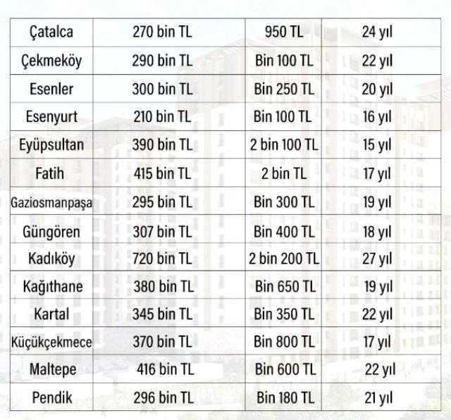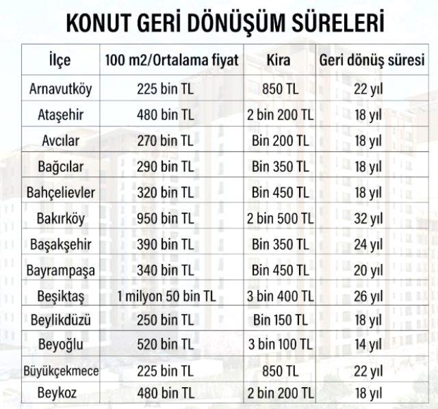 İstanbul genelinde satılıkta fiyat aralığı ortalamada ilçesine göre 200 bin TL'den başlayıp 1 milyonun üzerine çıkıyor. Kiralık tarafında ise 800 TL'den başlayıp 4 bin TL bandına kadar çıkıyor. Yine 1 milyon TL'lik bir konutun ortalama kirası 4 bin TL civarında iken söz konusu kira oranı ile geri dönüş süresi 20 yıl, 200 bin TL'lik 800 TL kiralı bir evin geri dönüşüm süresi de 20 yıl olarak karşımıza çıkıyor.