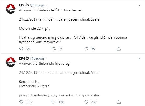 EPGİS tarafından Twitter üzerinden yapılan açıklamada benzine 16 kuruş zam geldiği belirtilirken, motorine gelen zamda 6 kuruşun pompa fiyatlarına yansıyacağını 22 kuruşluk zammın ise ÖTV’den karşılanacağı için pompa fiyatlarına yansımayacağı duyuruldu.