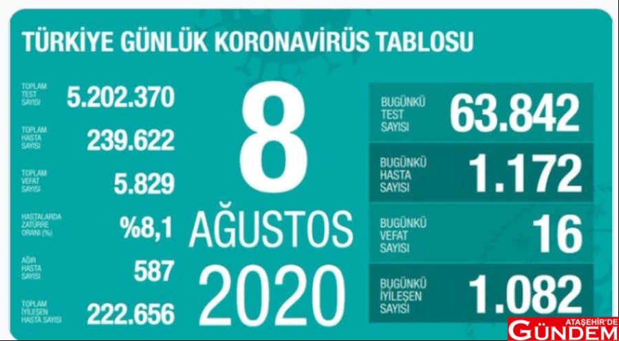 8 Ağustos 2020 Türkiye'nin güncel koronavirüs verileri Sağlık Bakanı Fahrettin Koca tarafından açıklandı.