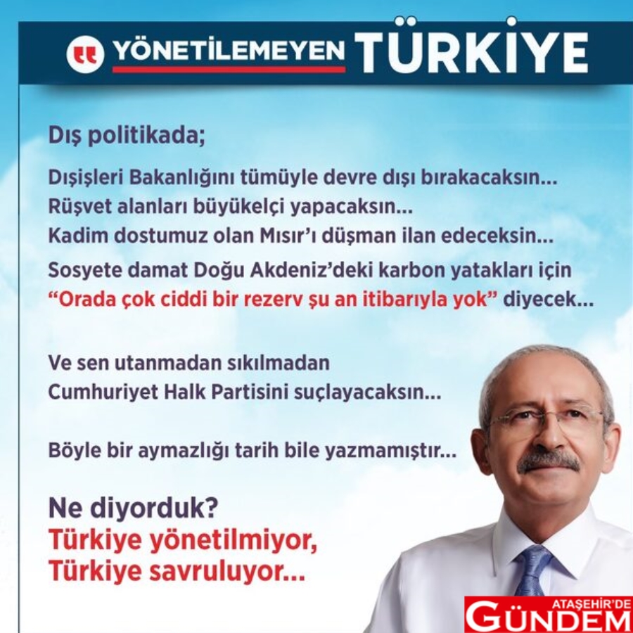 Kılıçdaroğlu’nun açıklamış şu şekilde: Dış politikada, Dışişleri Bakanlığını tümüyle devre dışı bırakacaksın... Rüşvet alanları büyükelçi yapacaksın... Kadim dostumuz olan Mısır'ı düşman ilan edeceksin... Sosyete damat Doğu Akdeniz'deki karbon yatakları için 'Orada çok ciddi bir rezerv şu an itibarı ile yok' diyecek... Ve sen utanmadan sıkılmadan Cumhuriyet Halk Partisini suçlayacaksın... Böyle bir aymazlığı tarih bile yazmamıştır... Ne diyorduk? Türkiye yönetilmiyor, Türkiye savruluyor."
