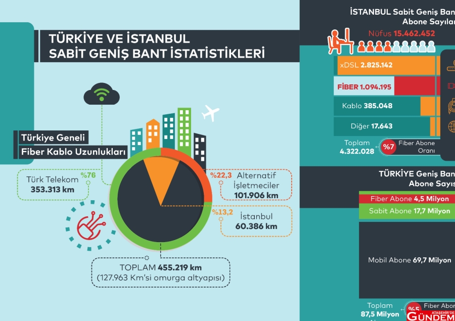 Bilgi ve İletişim Teknolojileri Kurumu (BTK) 2021 yılı 3. çeyrek verilerine göre; Türkiye geneli fiber kablo uzunluğu 455 bin 219 km, İstanbul’da ise 60 bin 386 km.