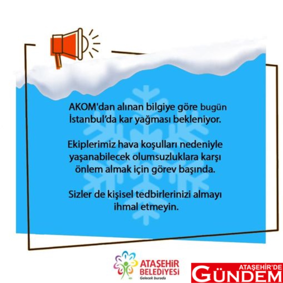 AKOM verilerine göre öğle saatlerinden itibaren Balkanlar üzerinden yeni bir soğuk havanın Marmara Bölgesi’ne giriş yapması bekleniyor. Ataşehir Belediyesi de AKOM'dan gelen bilgililer doğrultusunda vatandaşları uyardı.