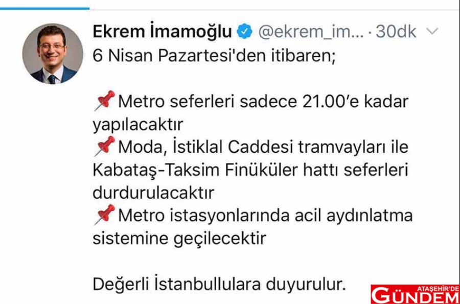 İBB’nin önerileri Pandemi Kurulu’na sunuldu ve İl Hıfzıssıhha Kurulu bilgisiyle kamuoyuna duyuruldu. Yeni planlamayı İBB Başkanı Ekrem İmamoğlu, sosyal medya mesajıyla İstanbullulara duyurdu. Metro seferlerinin 6 Nisan Pazartesi'den itibaren 06:00 - 21.00 saatleri arasında yapılacağını açıklayan Ekrem İmamoğlu, diğer kararlar ile ilgili şunları yazdı: