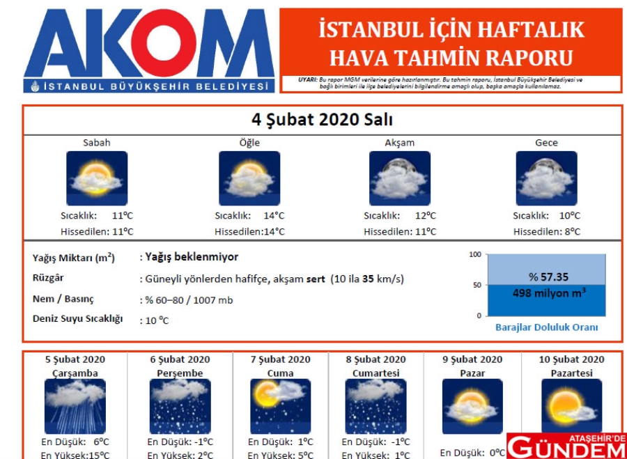 Çarşamba yer yer kuvvetli sağanak yağmur şeklinde görülecek yağışların Perşembe sabah saatlerinden itibaren Pazar gününe kadar aralıklarla kar şeklinde olacağı tahmin ediliyor. İstanbul’da hava sıcaklığının 6-10 Şubat tarihleri arasında mevsim normalleri olan 3-6°C altında seyretmesi bekleniyor.