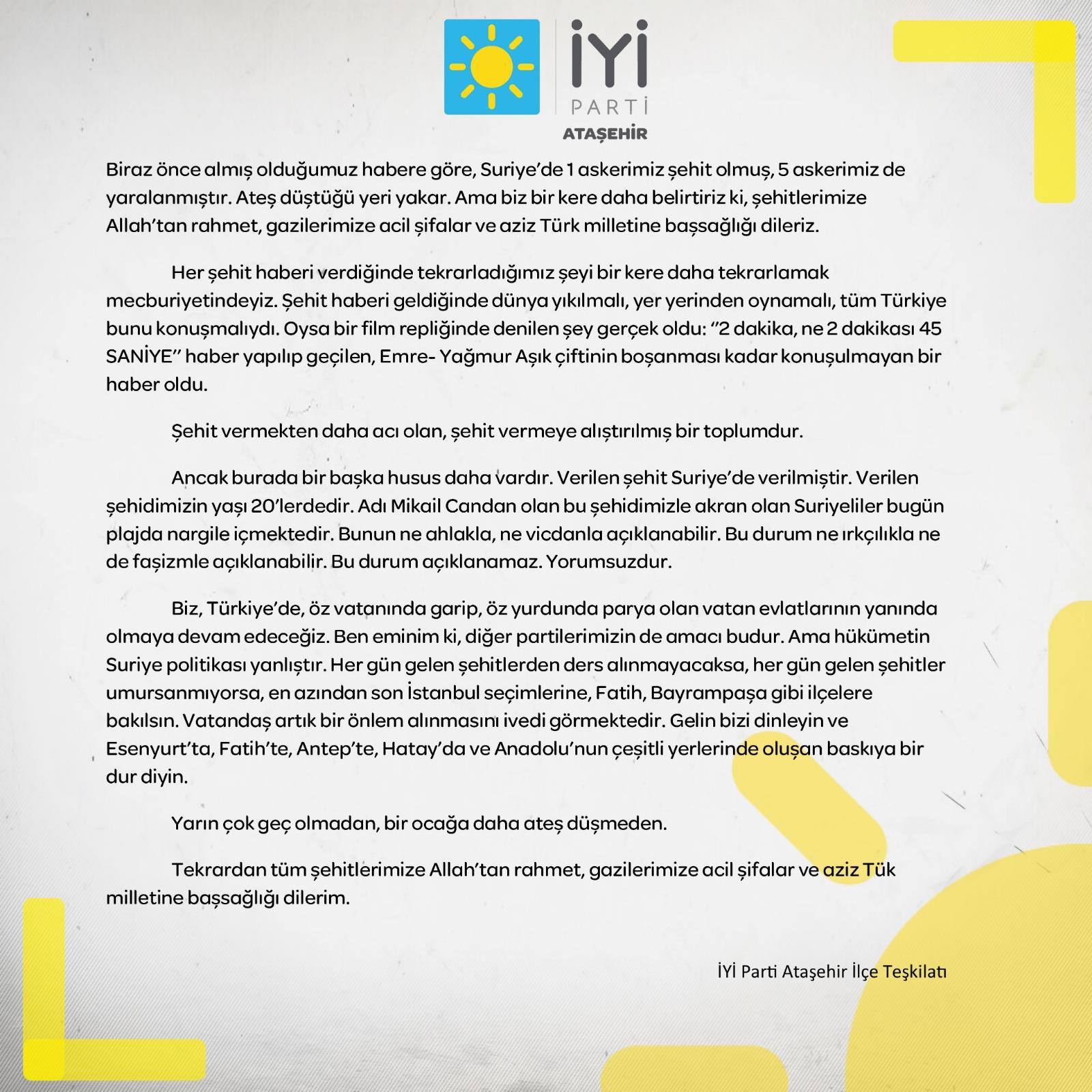 Suriye’de teröristlerle çıkan çatışmada şehit düşen Piyade Uzman Onbaşı Mikail Candan ve çatışmada yaralanan askerlerle ilgili İYİ Parti Ataşehir İlçe Başkanlığı açıklama yaptı. Yapılan açıklamada; ”Şehit vermekten daha acı olan, şehit vermeye alıştırılmış bir toplumdur.” cümlesi ile medyada şehit haberlerinin halka iletilmesindeki değersizliği ve Piyade Uzman Onbaşı Mikail Candan’ın Suriye’de şehit verilmesinin altı çizildi.