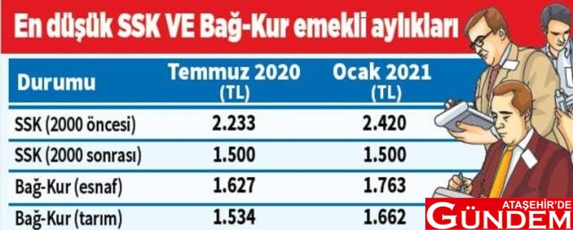 SSK ve Bağ-Kur emeklilerinin aylıkları da geçen yılın son 6 aylık enflasyonu oranına göre, yüzde 8.37'ye zamlanacak. Temmuz 2020'de, memur maaşları ile emekli memur, SSK ve Bağ-Kur emekli aylıklarına yüzde 5.75 oranında zam yapılmıştı.