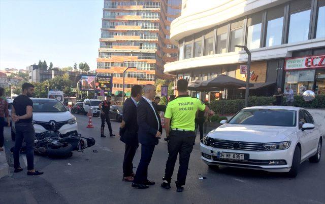 Ataşehir'deki bir alışveriş merkezinin çıkışından ana caddeye dönmek isteyen 34 NF 8351 plakalı otomobil, karşı yönden siren çalarak gelen motosikletli polislerden biriyle çarpışmaktan son anda kurtuldu. Arkadan gelen motosiklet ise otomobile sağ ön kısmından çarptı. Çarpmanın etkisiyle motosiklet yola devrilirken, polis memuru yaralandı. Olay yerine gelen sağlık ekipleri polis memuruna müdahale etti. Polisin kolundan hafif şekilde yaralandığı ve sağlık durumunun iyi olduğu öğrenildi. Otomobilin kadın sürücüsü ise kaza nedeniyle büyük üzüntü yaşadı. Kaza nedeniyle cadde bir süre trafik ulaşımına kapatıldı. Olay yerinde yapılan çalışmaların tamamlanmasıyla cadde yeniden trafik ulaşımına açıldı.