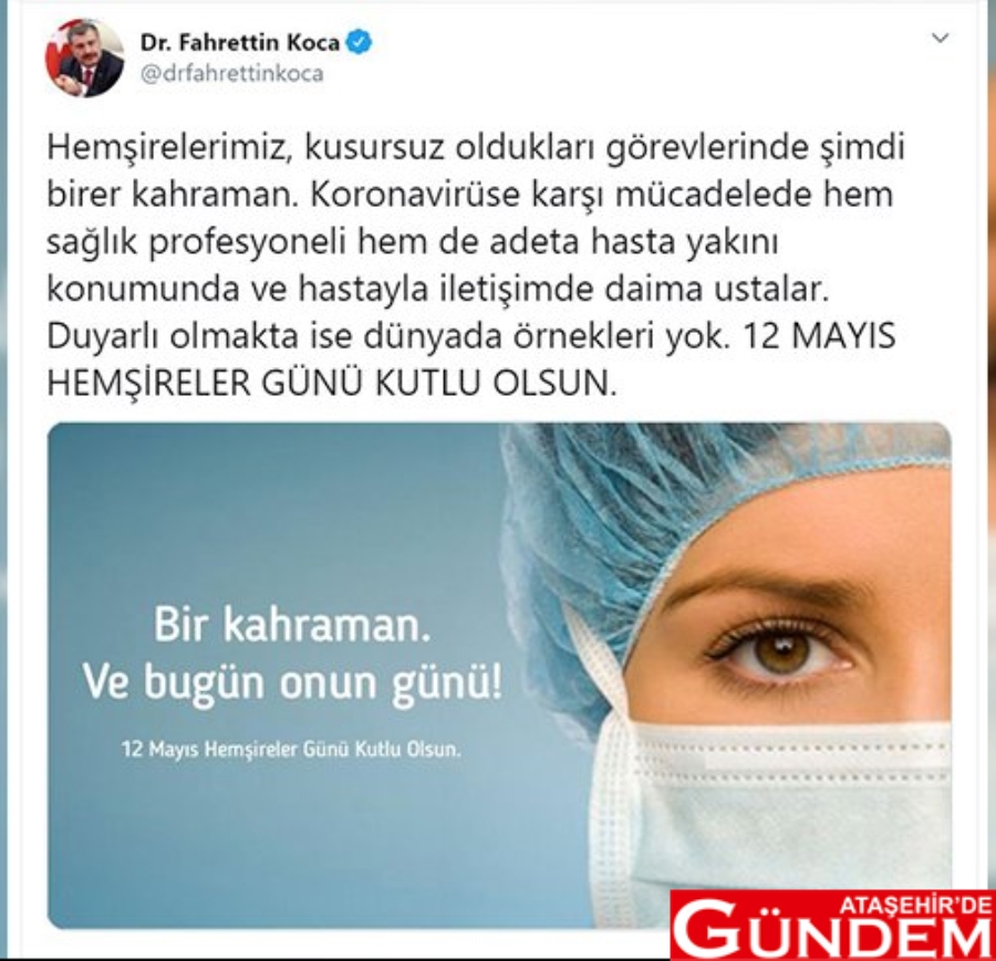 Sağlık Bakanı Fahrettin Koca,1964'ten itibaren ülkemizde de her 12 Mayıs Günü olarak kutlanan "Hemşireler Günü" için Twitter hesabından paylaşım gerçekleştirdi. "Hemşirelerimiz, kusursuz oldukları görevlerinde şimdi birer kahraman. 12 Mayıs Hemşireler Günü kutlu olsun" ifadelerini kullanan Bakan Koca, koronavirüs sürecinde sağlık çalışanlarının büyük emek ve özverilerine her fırsatta dile getirmişti.