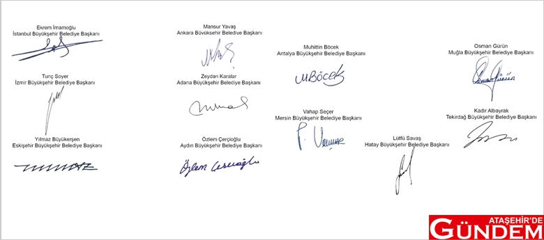 İstanbul Büyükşehir Belediye Başkanı Ekrem İmamoğlu, Ankara Büyükşehir Belediye Başkanı Mansur Yavaş, İzmir Büyükşehir Belediye Başkanı Tunç Soyer, Adana Büyükşehir Belediye Başkanı Zeydan Karalar, Eskişehir Büyükşehir Belediye Başkanı Yılmaz Büyükerşen, Aydın Büyükşehir Belediye Başkanı Özlem Çerçioğlu, Antalya Büyükşehir Belediye Başkanı Muhittin Böcek, Muğla Büyükşehir Belediye Başkanı Osman Gürün, Mersin Büyükşehir Belediye Başkanı Vahap Seçer, Tekirdağ Büyükşehir Belediye Başkanı Kadir Albayrak ve Hatay Büyükşehir Belediye Başkanı Lütfi Savaş, bugünkü buluşmalarının ardından şu açıklamayı yaptılar: