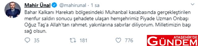AK Parti Genel Başkan Yardımcısı Mahir Ünal, Bahar Kalkanı Harekatı bölgesindeki Muhanbal kasabasında gerçekleştirilen saldırıda Piyade Uzman Onbaşı Oğuz Taş şehit olduğunu duyurdu. Ünal, Twitter hesabından yaptığı paylaşımda, "Bahar Kalkanı Harekatı bölgesindeki Muhanbal kasabasında gerçekleştirilen menfur saldırı sonucu şehadete ulaşan hemşehrimiz Piyade Uzman Onbaşı Oğuz Taş'a Allah'tan rahmet, yakınlarına sabırlar diliyorum. Milletimizin başı sağ olsun" ifadelerini kullandı.sözcü