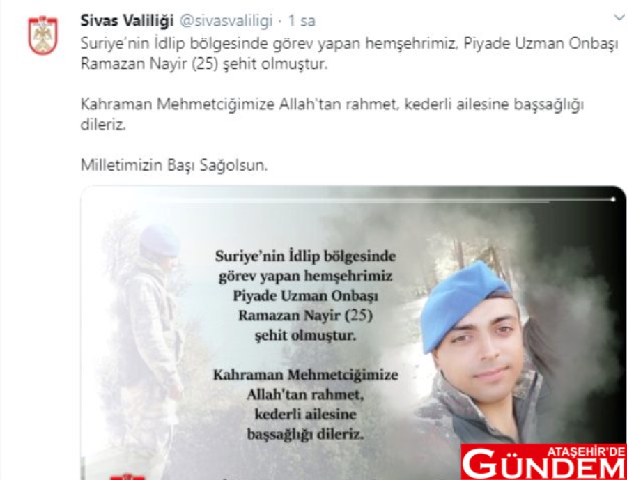 Sivas Valiliği'nden yapılan açıklamada, "Suriye'nin İdlib bölgesinde görev yapan hemşehrimiz, Piyade Uzman Onbaşı Ramazan Nayir (25) şehit olmuştur. Kahraman Mehmetciğimize Allah'tan rahmet, kederli ailesine başsağlığı dileriz. Milletimizin Başı sağ olsun" denildi.