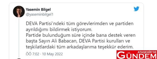 DEVA Dışişleri ve Güvenlik Politikaları Başkanı Yasemin Bilgel, sosyal medya hesabından yaptığı açıklamayla partiden istifa ettiğini duyurdu.