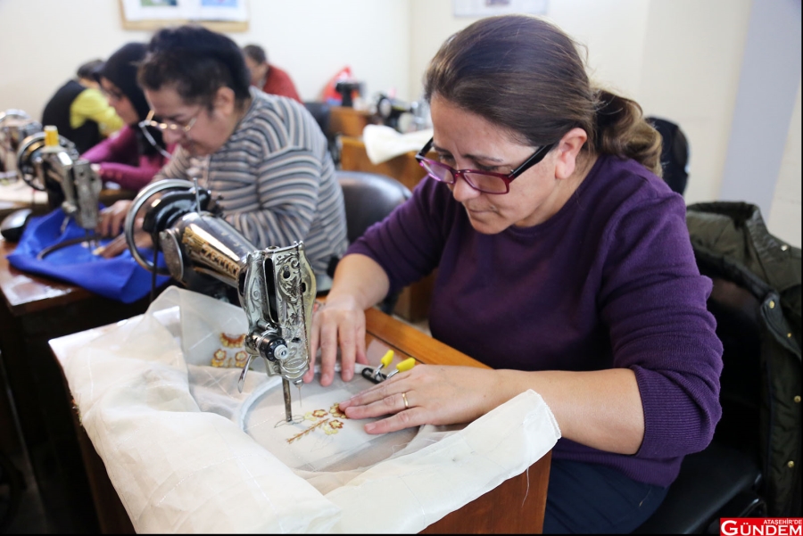 Bu kurslardan biri olan ve son zamanlarda en çok ilgi gören el sanatları arasında yer alan makine nakışı ve iğne oyası Ataevlerinde yetenekli kadınların ellerinde hayat buluyor.