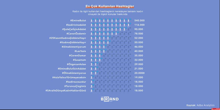 ‘’Kadın’’ ile ilgili kullanılan hashtagler incelendiğinde listede yer alan hashtaglerin neredeyse tamamının kadın cinayeti ile ilişkili konular olması dikkat çekiyor. 2018 yılında #8MartDünyaKadınlarGünü etiketi 420 bin kere kullanılarak ilk sırada yer alırken, bu yıl #EmineBulut cinayeti en çok konuşulan konu başlığı oluyor. Emine Bulut cinayetini 94 bin paylaşım ile #kadiricinadalet, 78 bin paylaşım ile #CerenÖzdemir, 54 bin paylaşım ile #ŞuleÇetİçinAdalet takip ediyor.