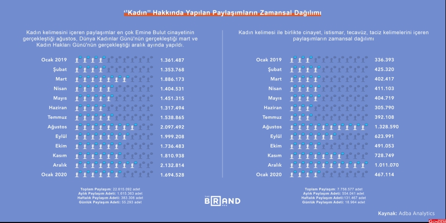 Raporda 2019 Ocak ayından itibaren ‘’kadın’’ ile ilgili yapılan paylaşımların tamamının yaklaşık 23 milyon adet olduğunu görülüyor. Sosyal medyada ‘’kadın’’ kelimesini içeren günlük ortalama 55 bin adet paylaşım yapılırken, zamansal dağılımda mart ve kasım ayında konuşulma oranında artış yaşanması dikkat çekiyor. Bu aylarda yapılan paylaşımların içeriğine bakıldığında; mart ayında Dünya Kadınlar Günü’nün, ağustos ayında Emine Bulut cinayetinin, aralık ayında ise Dünya Kadın Hakları Günü’nün yapılan paylaşımların hacmini artırdığı görülüyor.