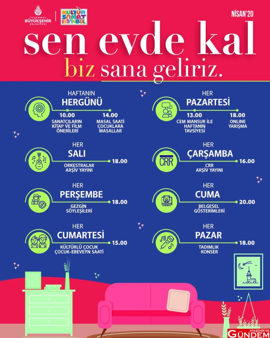İstanbul Büyükşehir Belediyesi Kültür Daire Başkanlığı, koronavirüs (COVİD-19) salgını nedeniyle, “Sen Evde Kal Biz Sana Geliriz” sloganıyla, kültür ve sanat etkinliklerini, online olarak sanatseverlerle buluşturmaya devam ediyor. Nisan ayı boyunca, hem yetişkinler hem de çocuklar için birçok kültür etkinliği, Kültür Daire Başkanlığı’nın sosyal medya hesaplarından ve Youtube kanalından yayınlanacak.