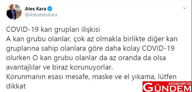 Kara, şunları yazdı: "A kan grubu olanlar, çok az olmakla birlikte diğer kan gruplarına sahip olanlara göre daha kolay COVID-19 olurken 0 kan grubu olanlar da az oranda da olsa avantajlılar ve biraz korunuyorlar. Korunmanın esası mesafe, maske ve el yıkama, lütfen dikkat"sondakika