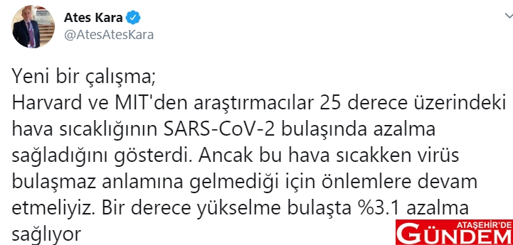 Sağlık Bakanlığı Bilim Kurulu üyesi Ataş Kara Twitter hesabından paylaştığı bilgi şöyle: “Yeni bir çalışma; Harvard ve MIT'den araştırmacılar 25 derece üzerindeki hava sıcaklığının SARS-CoV-2 bulaşında azalma sağladığını gösterdi. Ancak bu hava sıcakken virüs bulaşmaz anlamına gelmediği için önlemlere devam etmeliyiz. Bir derece yükselme bulaşta %3.1 azalma sağlıyor.”