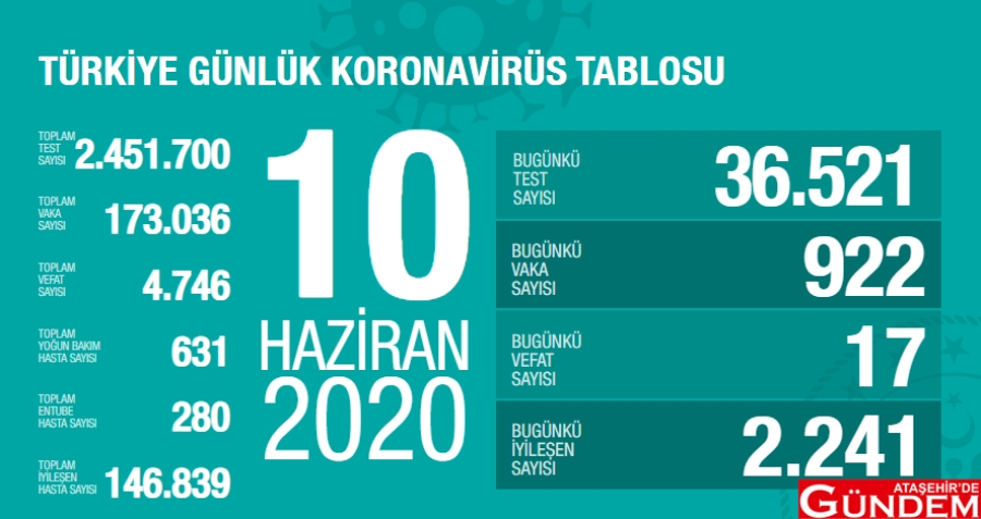 10 Haziran Türkiye Günlük Koronavirüs Tablosu’nu açıklayan Bakan Koca 922 yeni vakanın olduğunu, 36 bin 521 test yapıldığını, 2 bin 241 vakanın iyileştiğini 17 kişinin ise hayatını kaybettiğini söyledi. Sağlık Bakanı Fahrettin Koca ayrıca, Twitter hesabından yaş ortalamasının yeni vakalarda 36, vefatlarda da 71 olduğunu açıkladı.