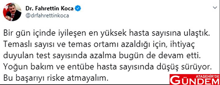 Twitter hesabından paylaşım yapan Bakan Koca, bir gün içinde iyileşen en yüksek hasta sayısına ulaşıldığını belirterek, temaslı sayısı ve temas ortamı azaldığı için ihtiyaç duyulan test sayısındaki azalmanın bugün de devam ettiğini duyurdu.
