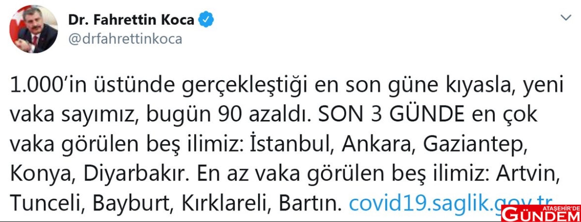 Günlük Koronavirüs tablosunu açıklayan Sağlık Bakanı Fahrettin Koca, şunları söyledi; "1000'in üstünde gerçekleştiği en son güne kıyasla, yeni vaka sayımız bugün 90 azaldı. Son 3 günde en çok vaka İstanbul, Ankara, Gaziantep, Konya, Diyarbakır'da; en az vaka Artvin, Tunceli, Bayburt, Kırklareli, Bartın'da görüldü."
