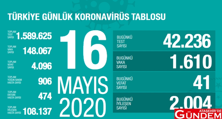 Sağlık Bakanı Fahrettin Koca’nın Twitter hesabından paylaştığı günlük koronavirüs tablosundaki iyileşen sayısı günden güne iyiye gitmeye başladı.Bakan Koca’nın 16 Mayıs koronvirüs tablosu için yaptığı açıklama şöyle: “Yoğun bakım hasta sayımızda yoğun bakıma giren hastalarımızdan vefat edenlerin oranı azalıyor. İyileşme hızınızdaysa öngörülebilir bir yavaşlama var. Koronavirüsün yayılmasına karşı verdiğimiz mücadele evde kaldığımız günlerin rolü çok büyük. Evde kalalım.”