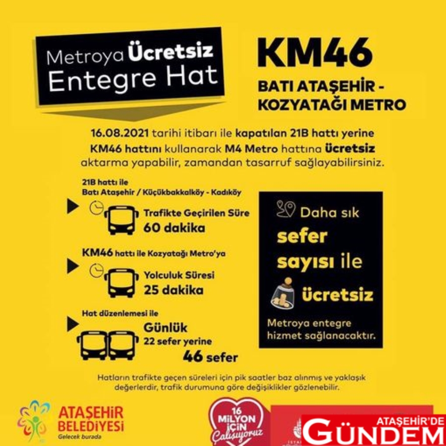 Kentin en büyük sorunu olan trafik için Ataşehir Belediyesi vatandaşlara kolaylık sağlamak ve zamandan tasarruf etmek amacıyla metroya ücretsiz entegre hat bağlanacağını duyurdu. Buna göre Batı Ataşehir- Kadıköy seferi yapan 21B yerine 16 Ağustos’tan itibaren hizmete girecek olan KM46 hattı ile Kozyatağı Metro durağına ücretsiz aktarma yapılabilecek. Ataşehir Belediyesi konuyla ilgili yapılacak olan çalışmayı sosyal medya hesaplarından şu mesajla duyurdu: “Değerli Ataşehirli komşularımız, kapatılan Batı Ataşehir - Kadıköy seferi yapan 21B hattı yerine 16 Ağustos’tan itibaren hizmete girecek olan KM46 hattı ile Kozyatağı Metro’ya ücretsiz aktarma yaparak zamandan tasarruf sağlayabilirsiniz.”