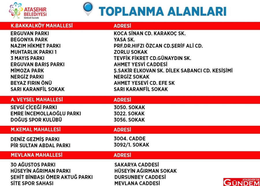 Ataşehir’de AFAD tarafından belirlenen 93 toplanma alanı bulunuyor. Ataşehir’deki size en yakın toplanma alanını, web sayfamızdaki Afet Bilgi Sistemi’nden öğrenebilirsiniz.