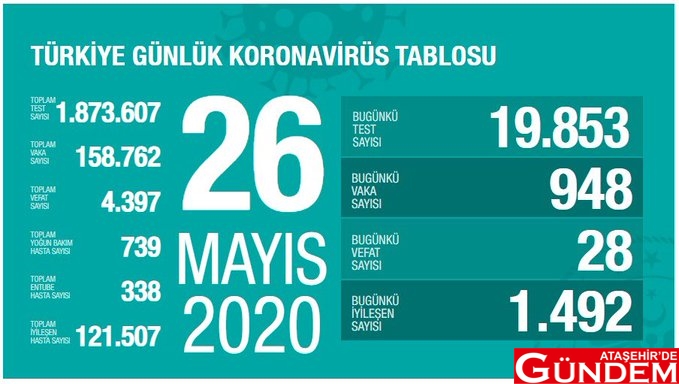 Sağlık Bakanı Fahrettin Koca 26 Mayıs Türkiyegünlük koronavirüs tablosunu açıkladı. Yapılan açıklamada bugünkü vefat sayısı 28, iyileşen vaka sayısı ise bin 492 olarak ifade edildi.