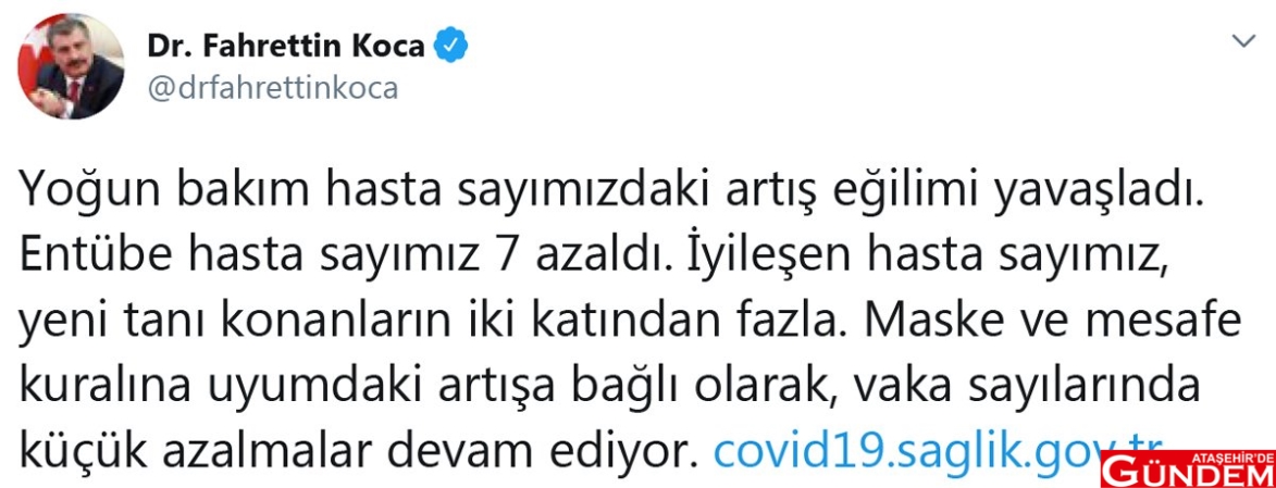 Sağlık Bakanı Fahrettin Koca, Türkiye Günlük Koronavirüs Tablosu’nu açıkladı. Güncel verileri sosyal medya hesabından paylaşan Bakan Koca, iyileşen hasta sayısının yeni tanı konanların iki katından fazla olduğunu belirtti.