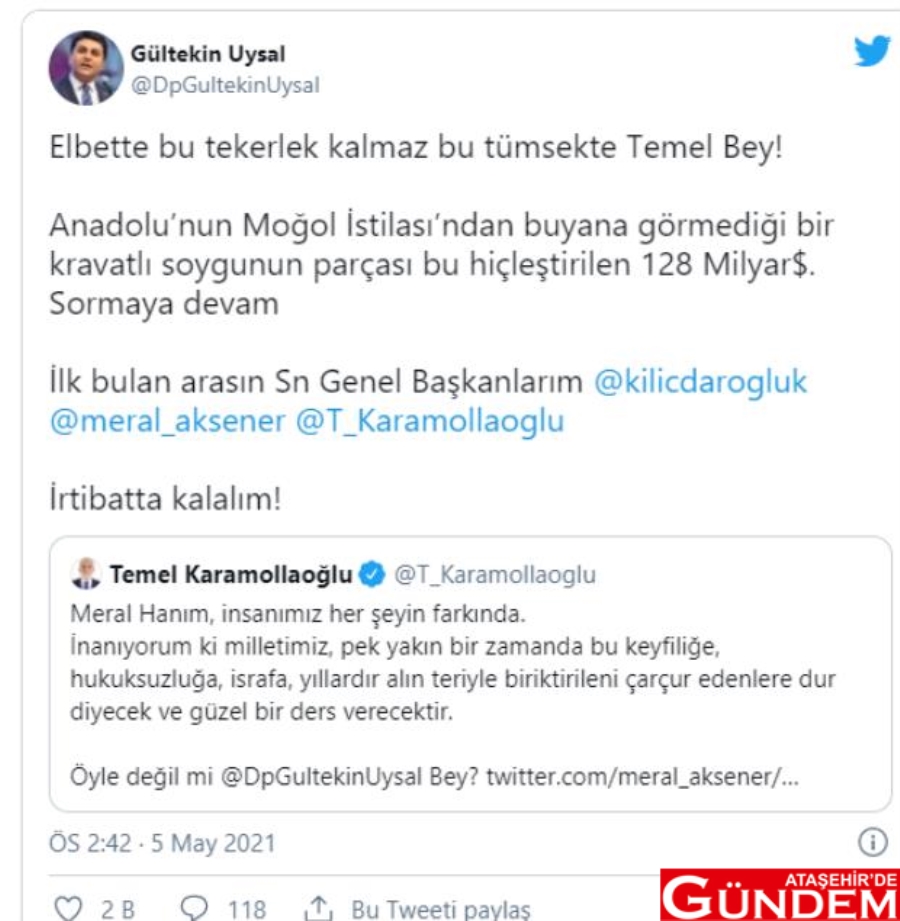 Son olarak ise Uysal, "Elbette bu tekerlek kalmaz bu tümsekte Temel Bey! Anadolu'nun Moğol İstilası'ndan bu yana görmediği bir kravatlı soygunun parçası bu hiçleştirilen 128 Milyar dolar! Sormaya devam. İrtibatta kalalım" ifadelerini kullandı.son dakika