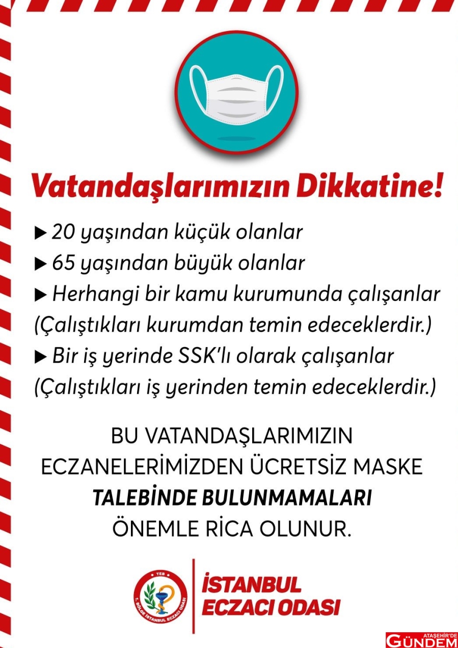 İstanbul Eczacı Odası, ücretsiz maske dağıtımıyla ilgili yeni bir düzenlemeye gidildiğini duyurdu. Duyuruda şu ifadelere yer verildi: