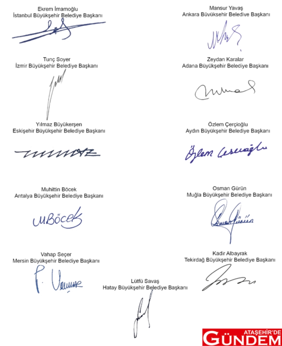 İstanbul Büyükşehir Belediye Başkanı Ekrem İmamoğlu, Ankara Büyükşehir Belediye Başkanı Mansur Yavaş, İzmir Büyükşehir Belediye Başkanı Tunç Soyer, Adana Büyükşehir Belediye Başkanı Zeydan Karalar, Eskişehir Büyükşehir Belediye Başkanı Yılmaz Büyükerşen, Aydın Büyükşehir Belediye Başkanı Özlem Çerçioğlu, Antalya Büyükşehir Belediye Başkanı Muhittin Böcek, Muğla Büyükşehir Belediye Başkanı Osman Gürün, Mersin Büyükşehir Belediye Başkanı Vahap Seçer, Tekirdağ Büyükşehir Belediye Başkanı Kadir Albayrak ve Hatay Büyükşehir Belediye Başkanı Lütfi Savaş, akşam saatleri gerçekleştirdikleri buluşmanın ardından şu açıklamayı yaptılar: