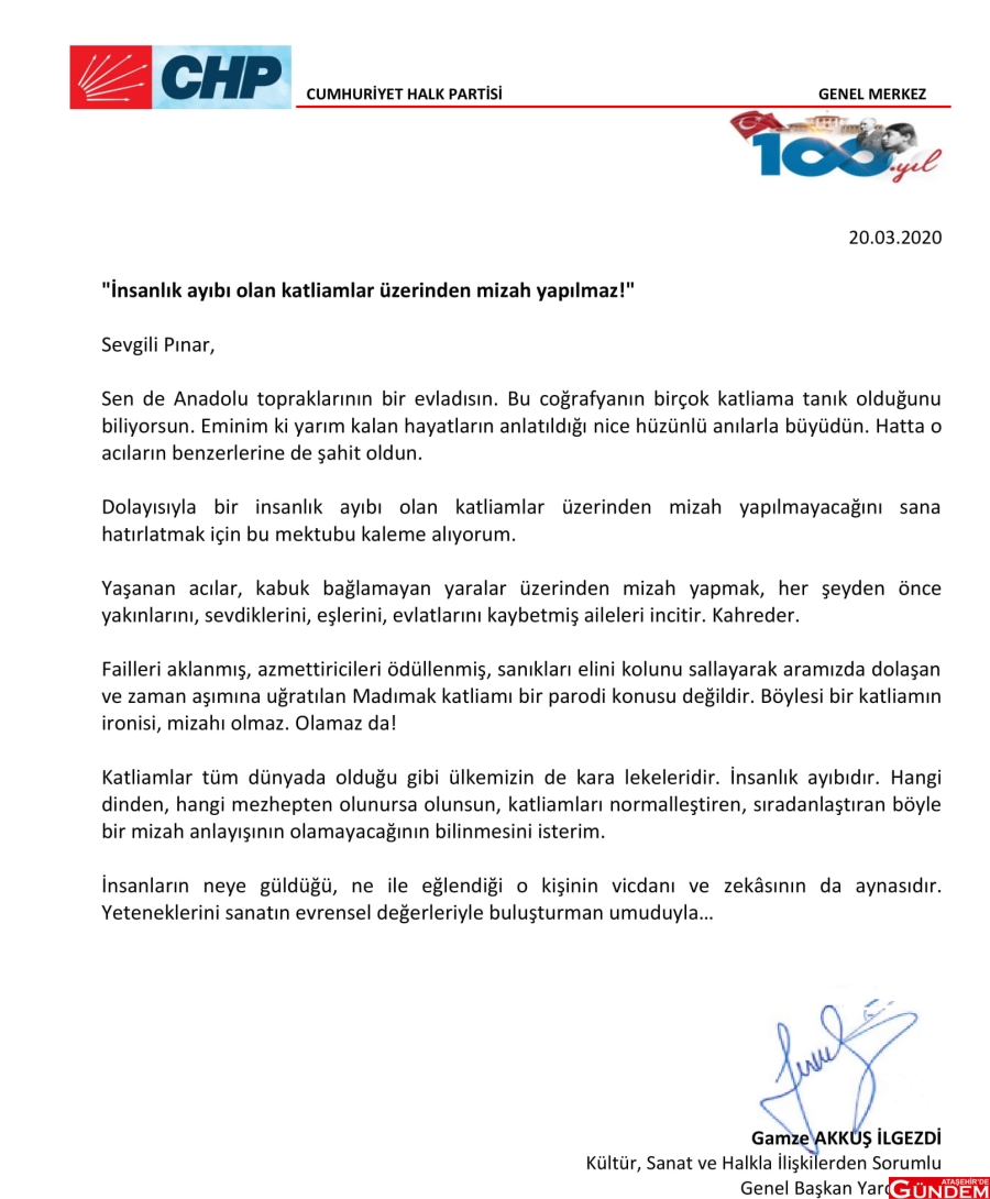 “Toplumda yerleşik ve her an ortaya çıkmaya hazır bir linç kültürü var. Bu kültür; aslında Madımak’ın faillerini koruyan, kollayan ve hatta “saygın” kişi haline getirerek, ödüllendirenlerin eseridir. Biz bu kültüre ortak olmamalıyız. Çünkü bu kültüre ortak olmak demek, geçtiğimiz yıllarda kapılarına çarpı işareti konan yurttaşlarımızın hukukunu korumayan, Maraş’ta, Sivas’ta, Malatya’da yaşanan vahşeti izleyenlerle, üstünü örtenlerle, planlayanları savunanlarla aynı hukuk sistemi içinde bulunmak demektir. Evet, Pınar haddini aşan, yaraların kabuğunu kaldıran, canımızı acıtan büyük bir yanlışa düşmüştür. Bu yanlışın karşılığı sosyal linç olmamalıdır. Haddini aşmış bir mizahın toplumda yarattığı hayal kırıklığını hep birlikte yaşıyoruz. Bu hayal kırıklığıyla tepkimizi gösterirken linç kültürünü besleyen, cinsiyetçi söylemlerle hakaret eden, tehditkar ifadelerden de kaçınmalıyız.”
