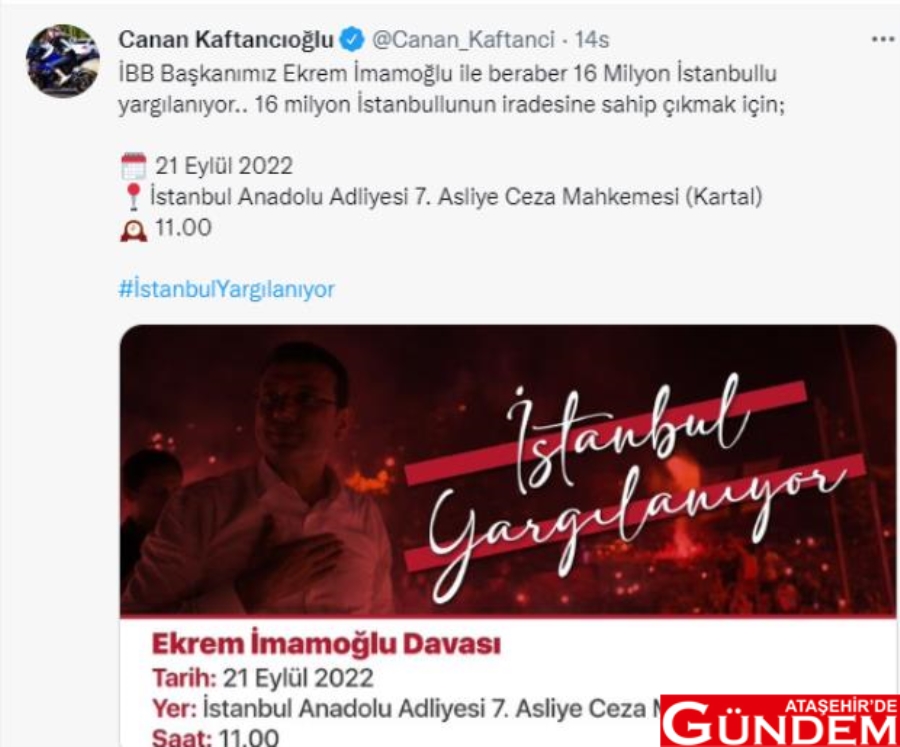 CHP İl Başkanı Canan Kaftancıoğlu ise İmamoğlu'nun bugünkü duruşmasına ilişkin sosyal medyadan bir paylaşım yaptı. Kaftancıoğlu vatandaşlara adliye önünde toplanma çağrısı yaptı.