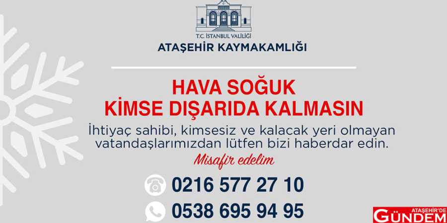 Ataşehir Kaymakamlığı,ihtiyaç sahibi, kimsesiz ve kalacak yeri olmayan vatandaşların olumsuz hava koşullarından etkilenmemeleri için vatandaşlara "Misafir edelim" çağrısı yaptı."Hava soğuk kimse dışarıda kalmasın" diyerek yola çıkan Kaymakamlık vatandaşların 0216 577 27 10 ve 0538 695 94 95 (WhatsApp) numaralarından yardım talebinde bulunabileceklerini belirtti.