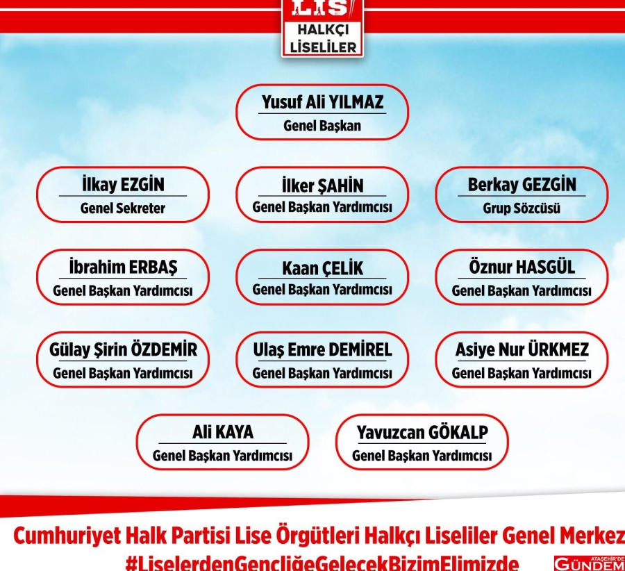 Siyasette önemli bir faktör olduklarını bilen ve “Liselerden Gençliğe Gelecek Bizim Elimizde” sloganıyla yola çıkan genç bireyler, Halkçı Liseliler (HALKLİS) olarak yeni dönem MYK listesini belirledi. Belirlenen listeye göre Halkçı Liseliler Örgütü Genel Başkan Yardımcıları arasında Ataşehir’den Kaan Çelik de yer aldı.